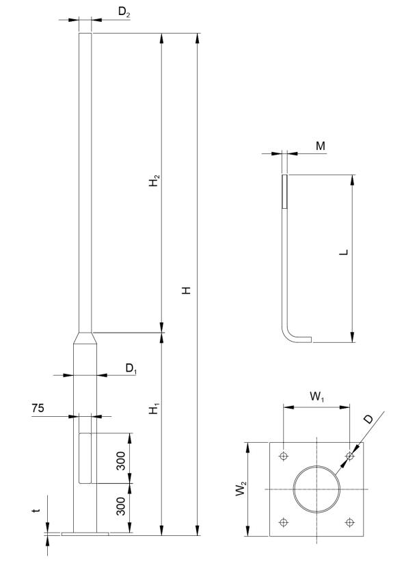 Model H H₁ H₂ D₁ D₂ W₁ W₂ t D L M Weight