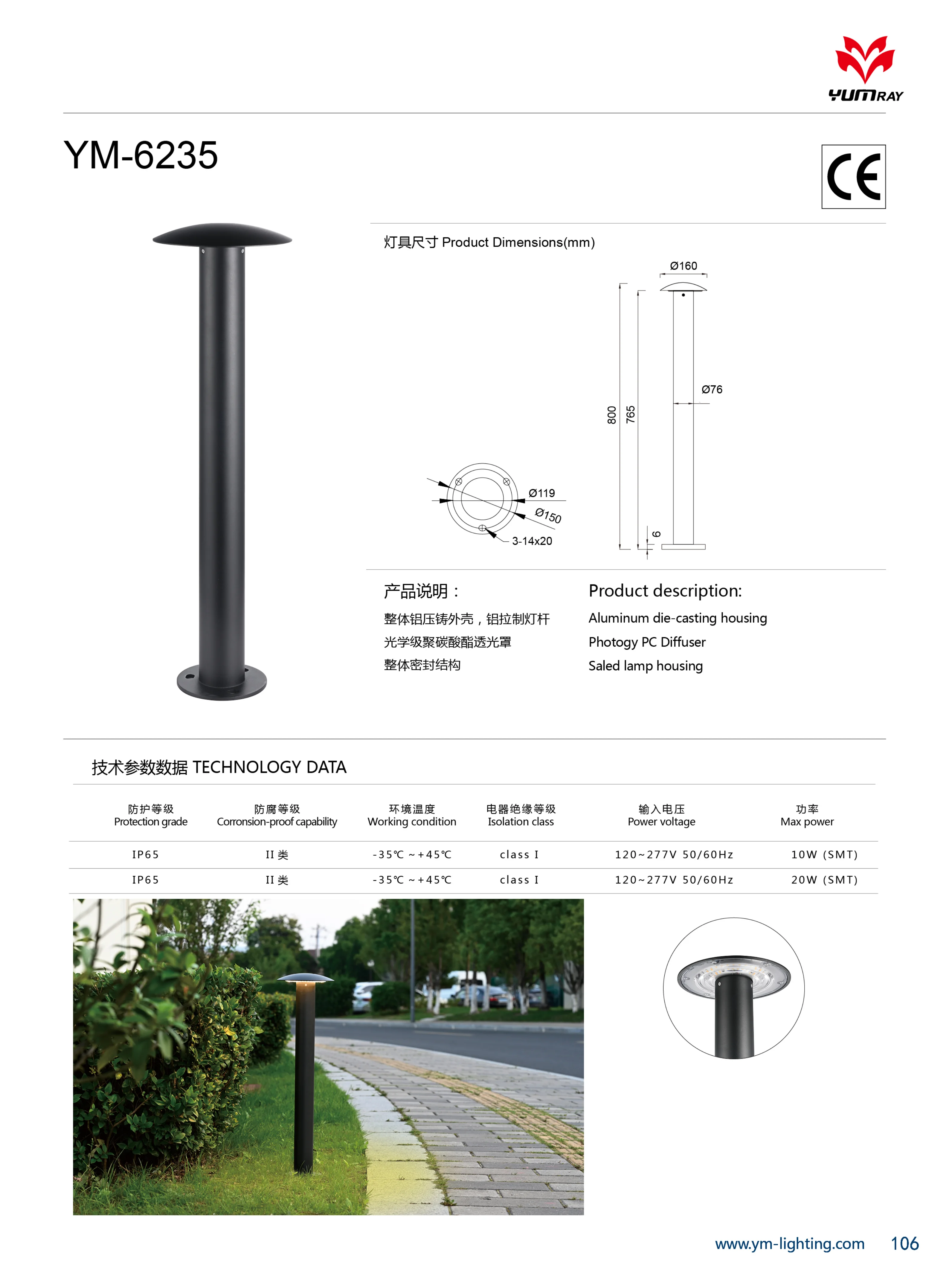 > YMLED6235 China supplier aluminum LED bollard light outdoor lighting 20W